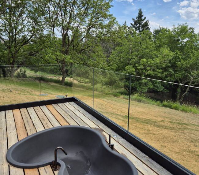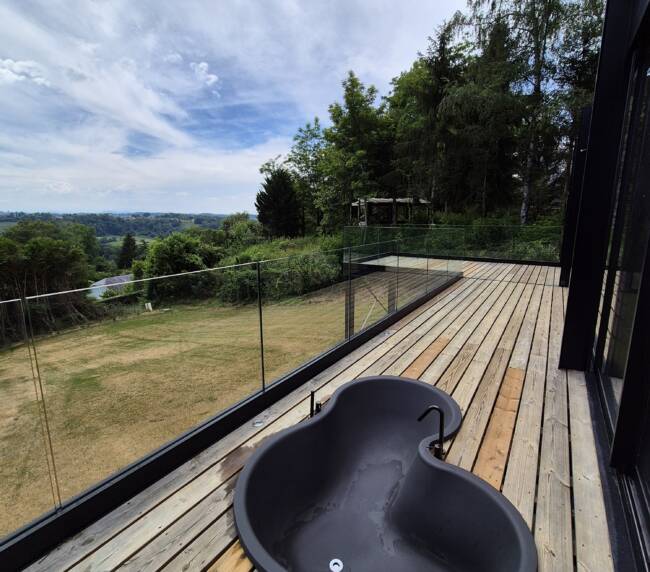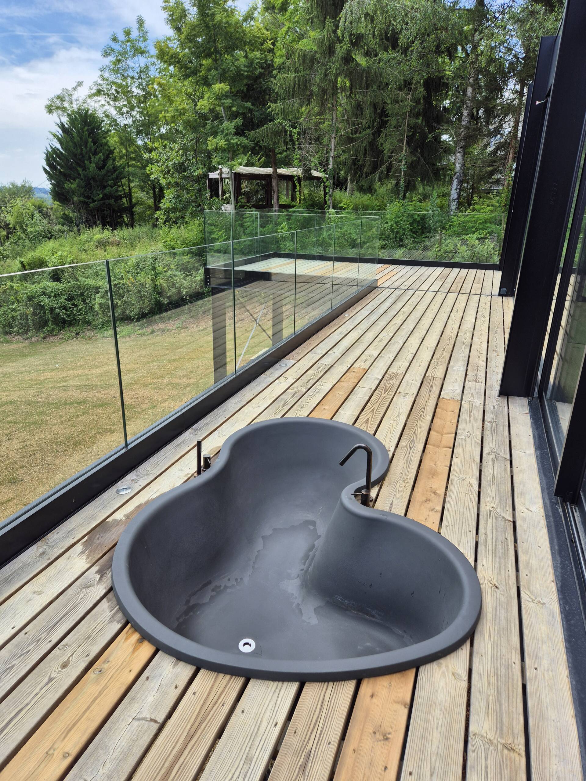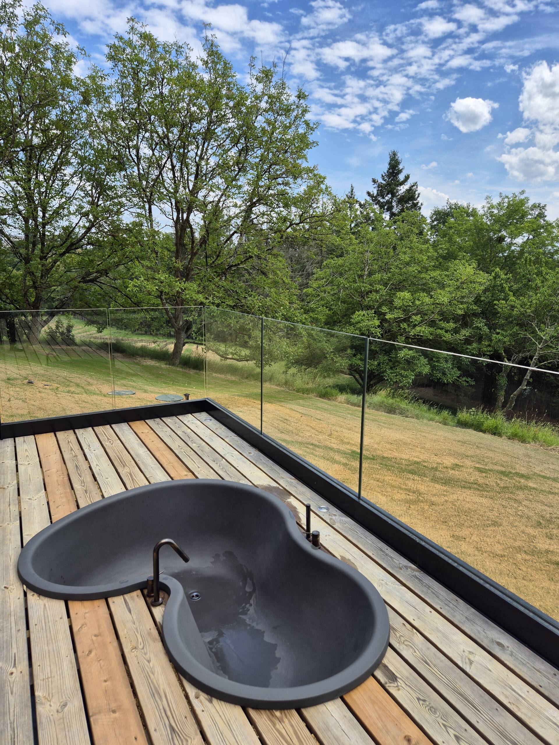 Un défi technique relevé par nos équipes : le raccordement et la pose d’une baignoire extérieure, incluant une gestion spécifique de l’évacuation et de l’étanchéité pour résister aux intempéries.
